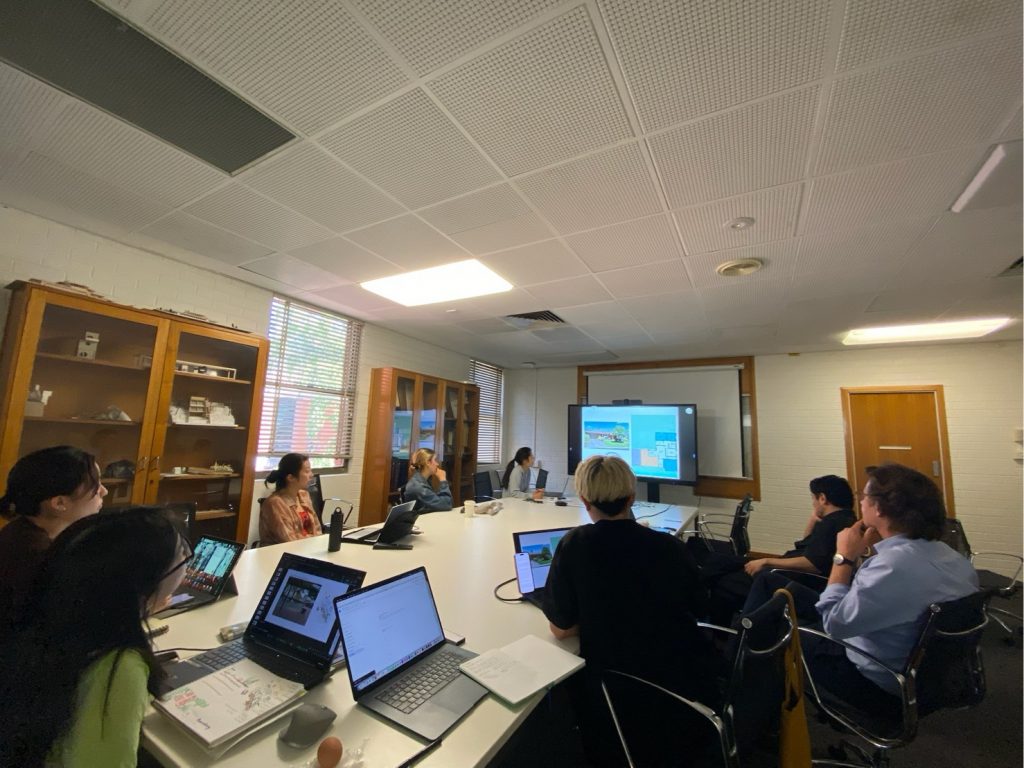中間発表では、David教授およびMirai教授によるエスキスを受け、それぞれの調査から見出した関心点や、今後さらに掘り下げていきたい課題について共有を行った。その後、リノベーションによって再生されたイノベーション拠点であるTonsley Innovation Districtを訪問し、イノベーション創出を目的とした建築プロジェクトの見学を行った。